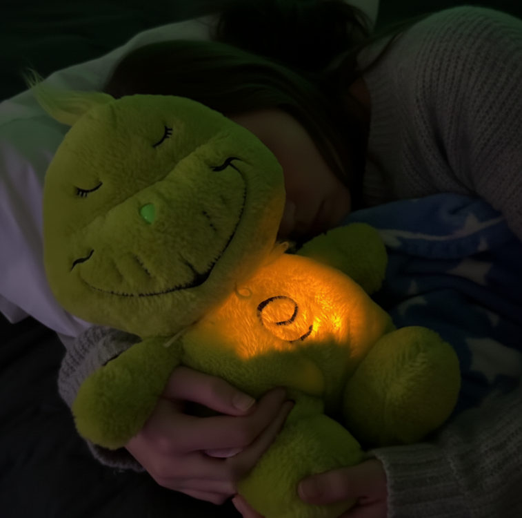 Meet Grinchly, the cuddly companion that guides you to a calm, blissful slumber with gentle breathing rhythms and a warm night-light glow.